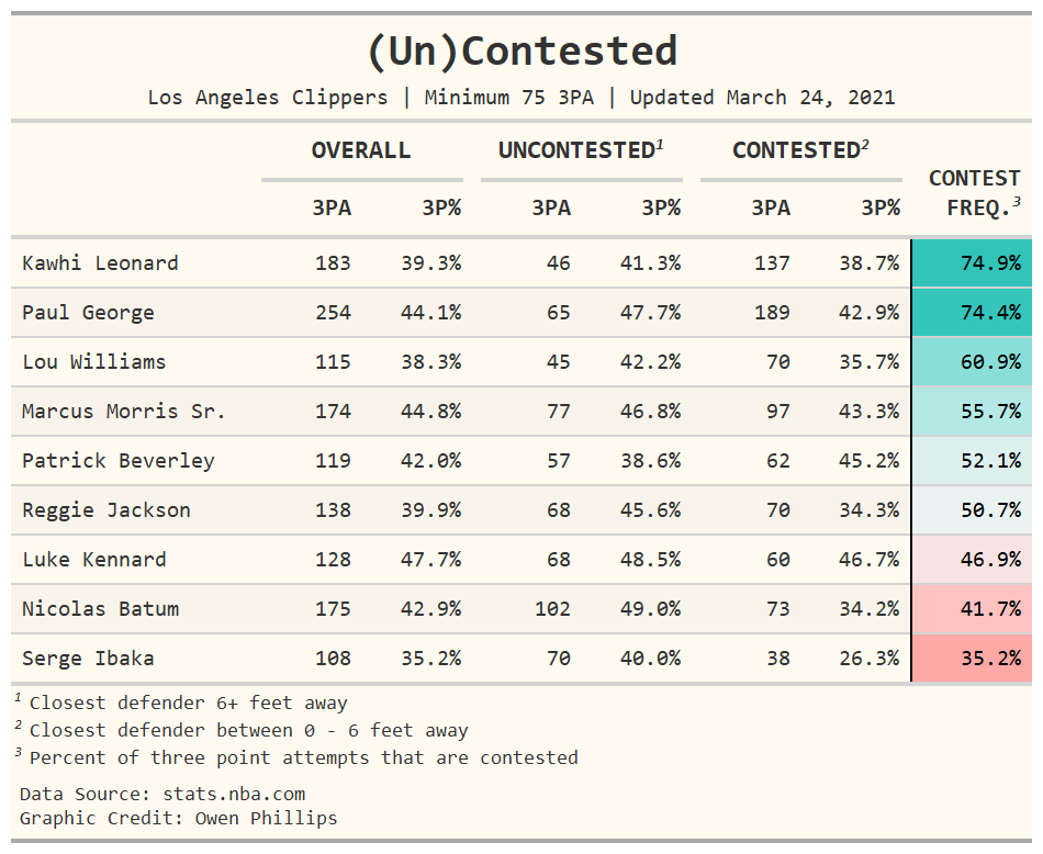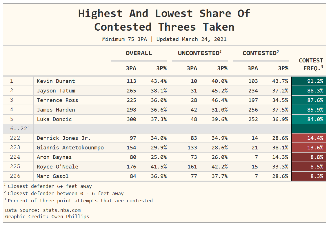 The column to pay attention to is the colored one on the right side of the table, which shows the frequency with which a player takes contested threes. This value is a reasonable proxy for estimating how much defenses respect and react to the threat of a player’s outside shooting ability. In this column, higher percentages indicate that defenses are reticent to leave the player open, while lower percentages indicate a lack of concern when the shooter is unguarded. It follows then that the higher the percentage, the more a player stretches the defense and visa versa. For context, Kevin Durant leads the league in the share of threes taken that are contested at 91 percent. Meanwhile, Marc Gasol is last in the league at 8 percent.2