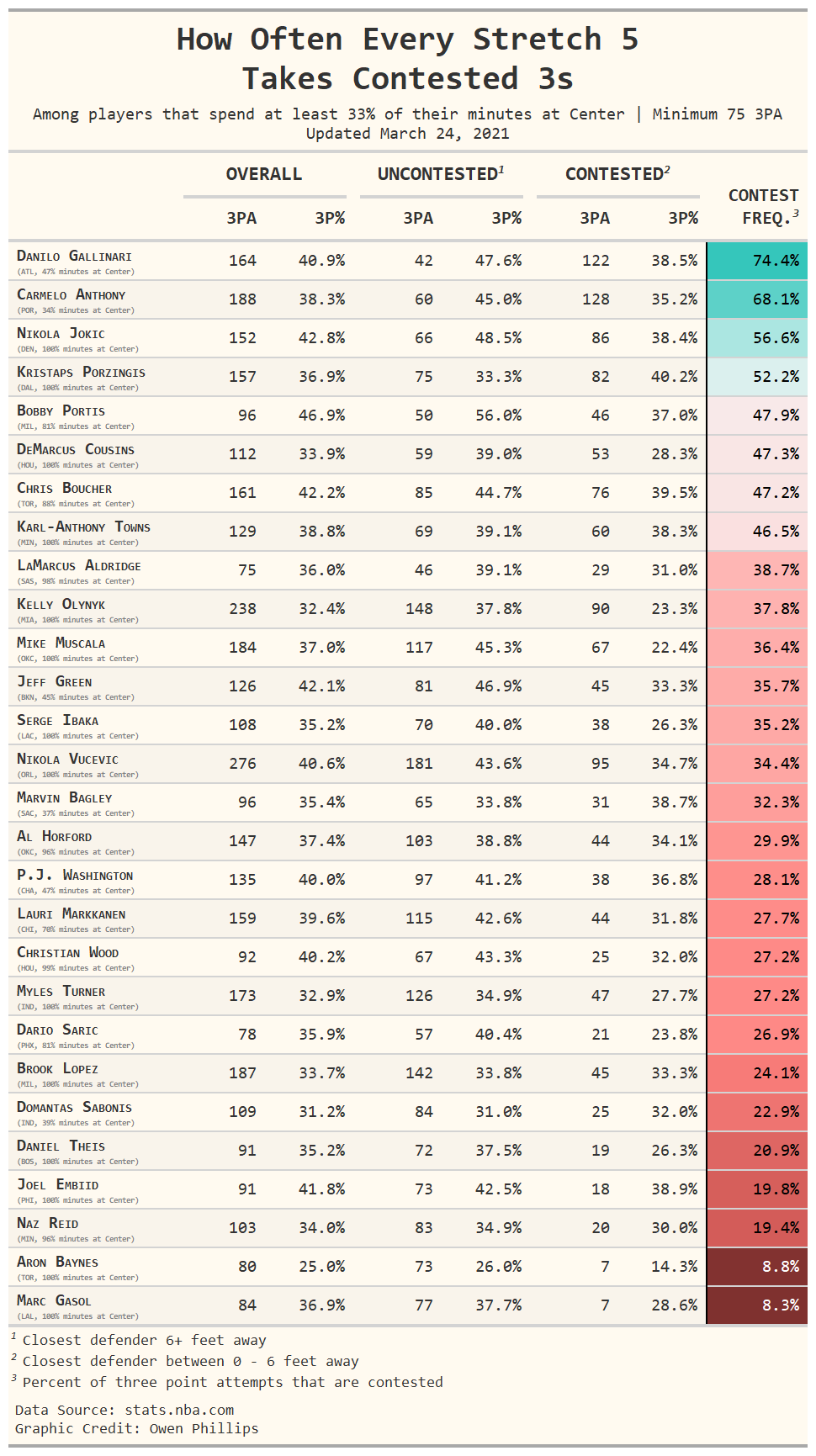 The only players on this table that I might consider Stretch 5s are Nikola Jokic, Kristaps Porzingis, Bobby Portis, DeMarcus Cousins, Chris Boucher, and Karl-Anthony Towns. All six players take at least 40 percent (my own subjective Mendoza Line for determining whether a player is a floor spacer or not) of their threes when the defense is within six feet and each one spends the plurality of their minutes at the Center position. But the difference in how frequently these guys take contested threes compared to a small ball 5 like Gallinari is massive.