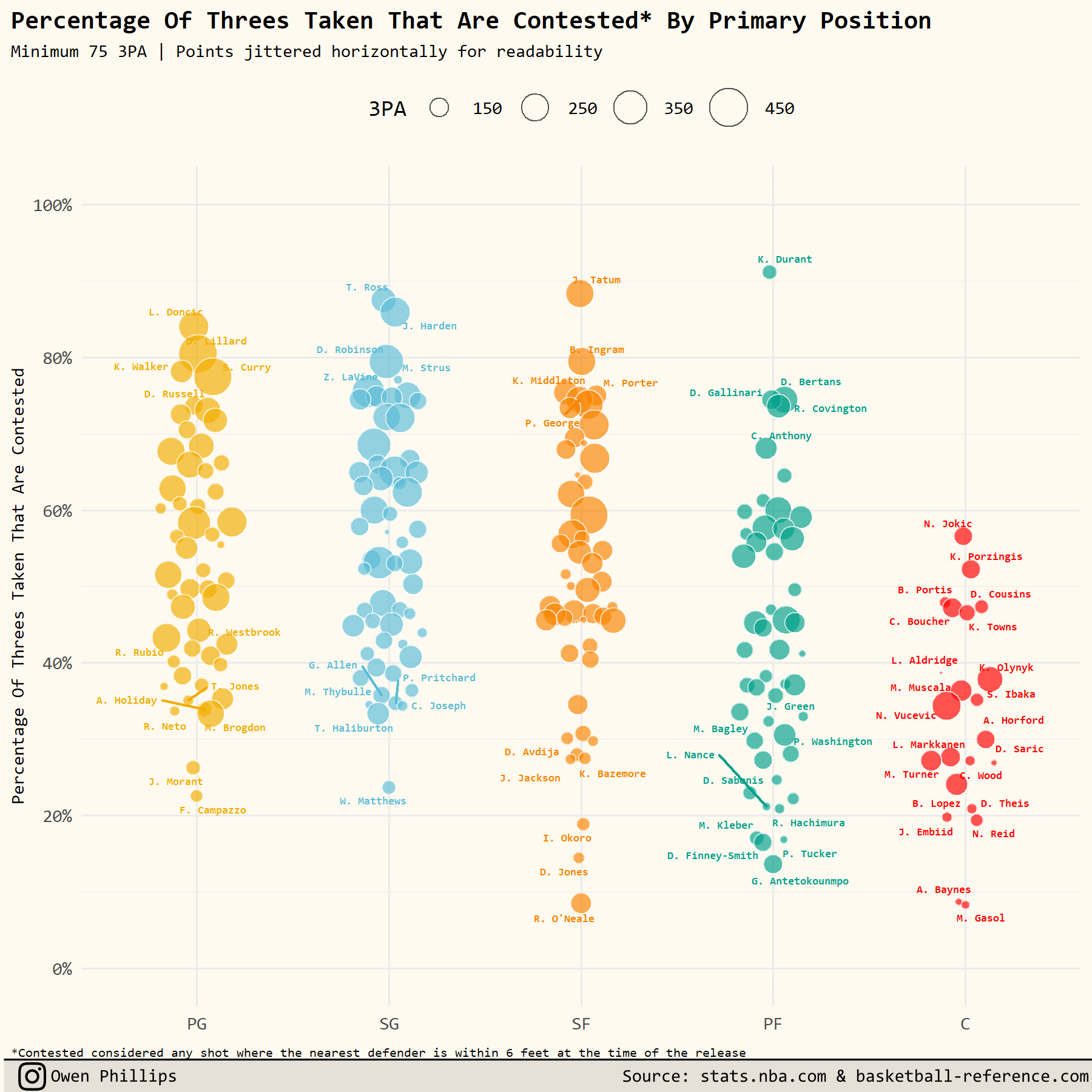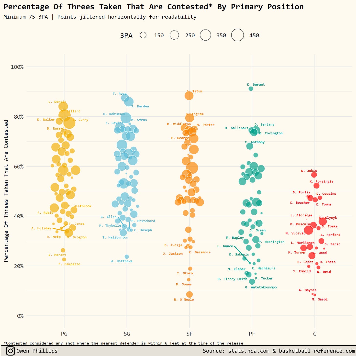 Friend of The F5, Seth Partnow, has written extensively about the problems with these naming conventions. The tl;dr of it is that it’s more accurate to describe any shot where the defender is within 6 feet as “Contested” and any other shot as “Uncontested.” In other words, “Open” shots aren’t really all that open. So when I say a shot was “uncontested” I’m only referring to shots that were labeled as “Wide open” on stats.nba.com. Todd Whitehead has a great Twitter thread showing visual examples of each type of shot category.